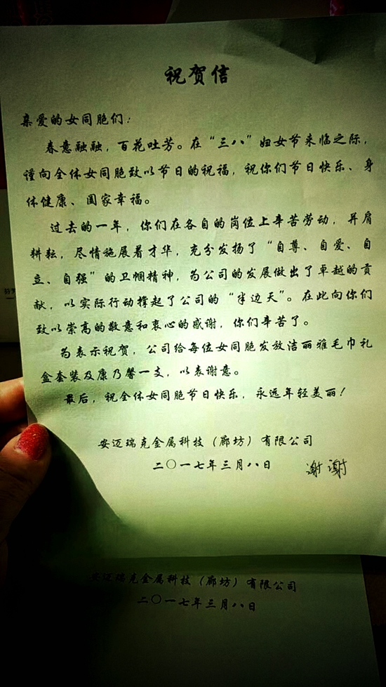 這些美麗、勤勞、善良的女員工發(fā)揮著各自的才華和智慧,她們以自己的實(shí)際行動(dòng)撐起了公司的“半邊天”, 公司的發(fā)展離不開她們的辛勤付出。在這個(gè)特別的日子里,公司為每位女員工準(zhǔn)備了節(jié)日禮品及祝賀信,體現(xiàn)了公司對女員工的關(guān)愛和尊重。